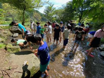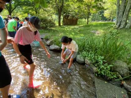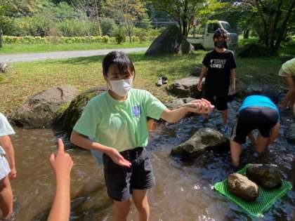 鱒つかみ体験です。1人1匹、清流を泳ぐ鱒をつかまえます。この後、塩焼きにして夕食の時にいただきます。私たちが食べるということは命をいただいていることなのだという思いには至らなかったかもしれませんが、みんな一生懸命つかまえていました。