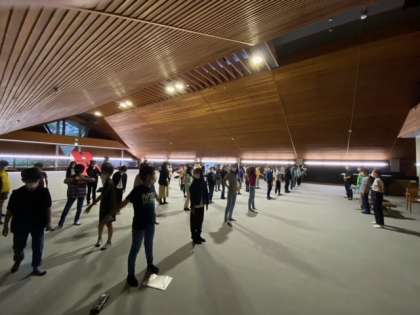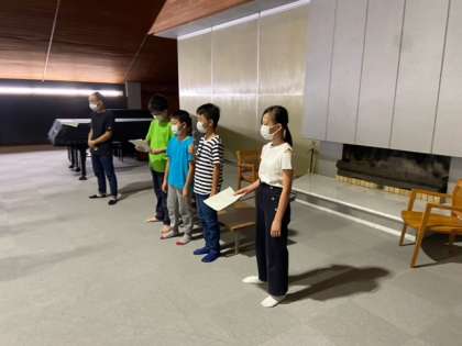 霧雨が降っています。朝会を行いました。最終日2日目のスタートです。司会がしっかりと進行し体操で体をほぐしました。今日もいい日になりそうです。