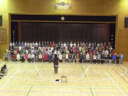 1年生が、「パンのマーチ」の歌を披露し、その後、全校児童で歌いました。