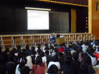 5・6年生は、体育館で吉澤主任教諭から3・11震災後の現地の様子について話を聞いた後、ワークシートをやりました。