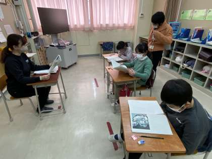 拡大した挿絵に黄色と青色のセロハンを張って昼と夜の情景のちがいを感じ取ってから音読しました。