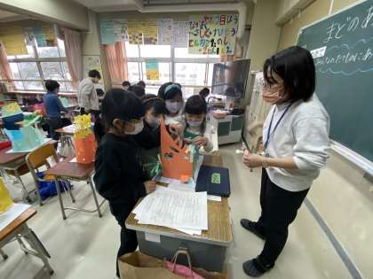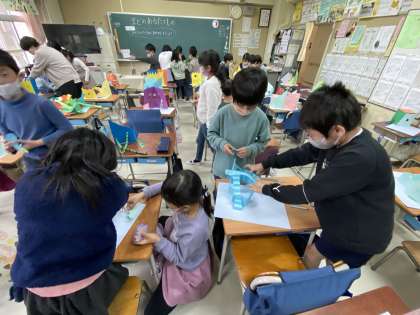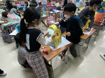 子どもたち一人ひとりが、手作りした自分の分身をもって、友達の作品を訪れて鑑賞します。