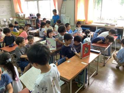 今日は2年生との交流の様子を紹介します。2年生が好きな本を1年生に読み聞かせするということで、1年生はとても楽しみにしていました。読み聞かせが始まると夢中でお話を聞いていました。2年生とまた一つすてきな交流をすることができました。