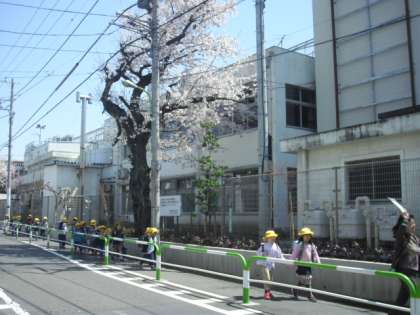 満開の桜の下、1年生が学校生活の一日を終え、下校しました。