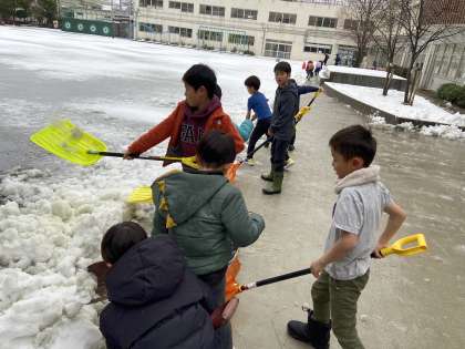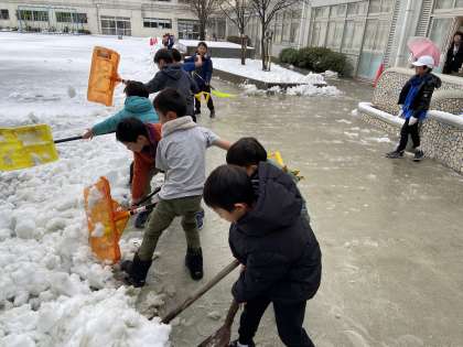 朝、子どもたちが来る前に先生たちで雪かきをしていると、