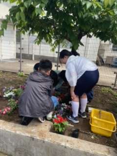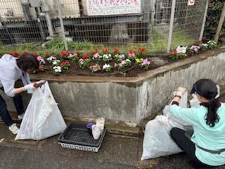 5月7日に、用賀南町会・世田谷社会福祉協議会等、地域の方々が、花を植えてくださいました。あいにくの雨の中、傘もささずに作業する姿に頭が下がります。
