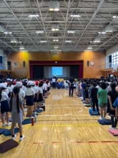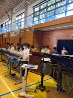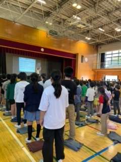 今回から6年生4クラスが体育館の角にそれぞれ並ぶ隊形をとりました。最初は「校歌」次に「大きな歌」を元気いっぱい歌いました。退場は、音楽委員の演奏による「RPG」です。練習の成果を発揮して上手に演奏できました。
