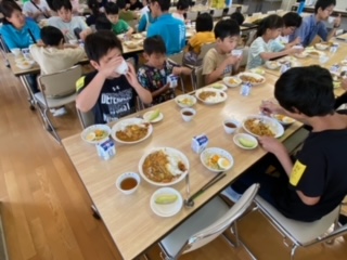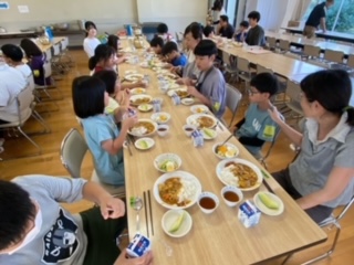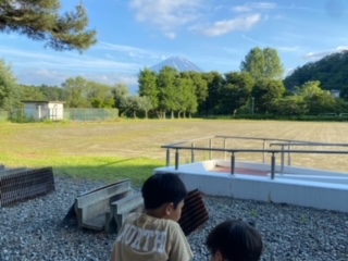 夕ご飯です。カレーライスです。きれいな夕焼けの富士山に見守られながら食べました。たくさんおかわりした子もいました。今日は星空も見られそうです。
