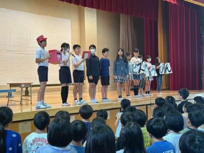 7月1日の桜町タイムで、ハッピースマイルフレンド委員会の児童が「ハピスマ郵便」という企画の発表を行いました。