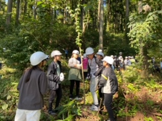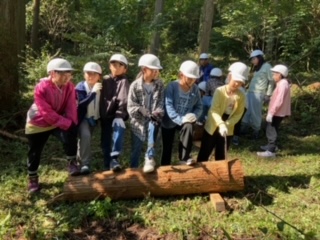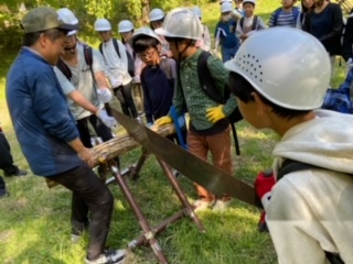 林業体験です。丸太を切ったり除伐をしたりして、みんな真剣に取り組んでいます。林業という大切な第一次産業について学ぶよい機会です。
