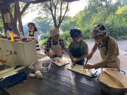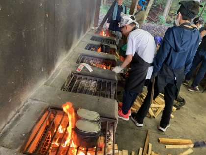 飯ごう炊さんが始まりました。火をおこし、カレーを作ります。みんな楽しそうです。すぐ横を沢が流れています。「きれいな音ですね」と話しかけてくる子どもにうれしくなりました。美しい夕方です。