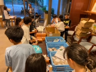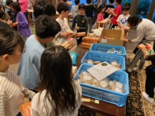 お土産を買っています。お風呂の時間と交互に買い物です。リンゴジュースやクッキーなど、みんな一生懸命選んでいます。