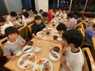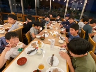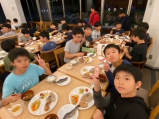 夕食です。先ほど捕まえた鱒の炭火焼きと午前中に作ったこんにゃくもあります。こんにゃくは味を変えるために宿の方が鰹節と麺つゆを用意してくださいました。命をいただくという実感につながるといいです。