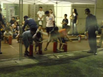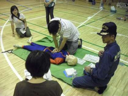 学校の防災倉庫の見学、貯水槽の見学をはじめ、「初期消火訓練」「炊き出し訓練」「救命訓練(AED)」「119番通報訓練」「応急担架訓練」、区の出張所、玉川消防署、玉川警察署の皆様からのレクチャーを受けました。