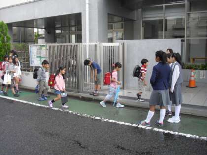 本校卒業生の深沢中学校の生徒の皆さんが朝早くから本校の校門の前で、子どもたちと朝の挨拶をしてくれました。
