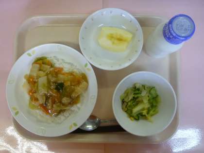 昨日(10/29)の給食の画像です。魚介類や野菜がたっぷり入った「中華丼」は薄味でしたが、子どもたちは白いごはんにかけてたくさん食べてくれました。