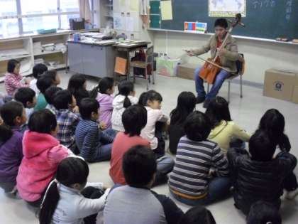 子どもたちに、馬頭琴の演奏を聞かせていただき、モンゴルの言葉も教えていただきました。