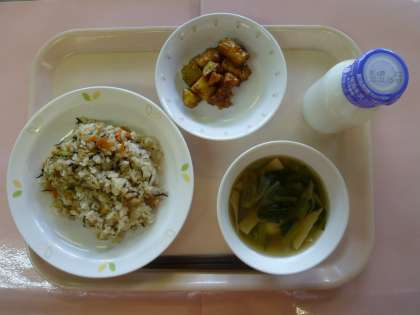昨日(11/8)の給食の画像です。「いかとさつまいもの揚げ煮」は初めてのメニューでしたが、とてもよく食べてくれました。