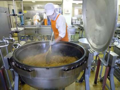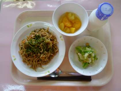 昨日(11/13)の給食の画像です。左の写真は「ソース焼きそば」を炒めている様子です。880人分の「ソース焼きそば」を炒めるのはとても大変な作業ですが、調理員さんは一生懸命調理してくださっています。