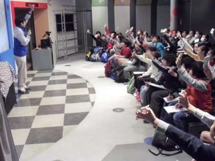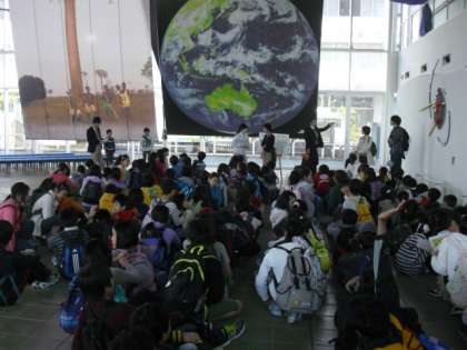 「環境エネルギー館」では、映像やワークショップ、ビオトープ、いろいろな装置による体験で、地球を守るために自分でできることについて考えました。