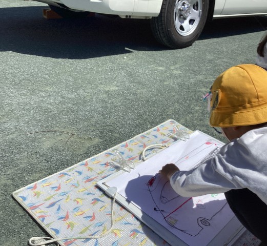 子どもたちは近くで見る車に大興奮しながら上手に絵を描きました。
