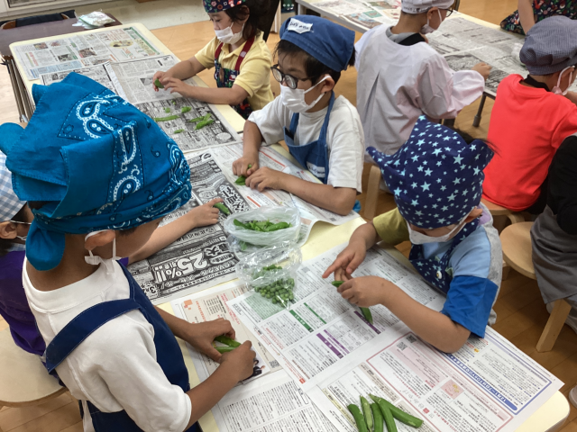 5月22日木曜の1時間目に、グリーンピースの皮むきをしました。グリーンピースの特徴や剥き方の説明動画を見た後に、一つひとつ丁寧に皮を剥くことができました。子どもたちが剥いたグリーンピースは、今日の給食にグリーンピースごはんとして出てきておいしく食べました。後片付けまでしっかりと行いました。