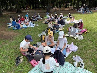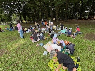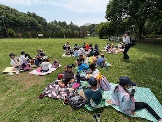 たくさん遊んで、お弁当です。場所を移動しました。クラスごとにいただきますをして楽しい時間を過ごしています。