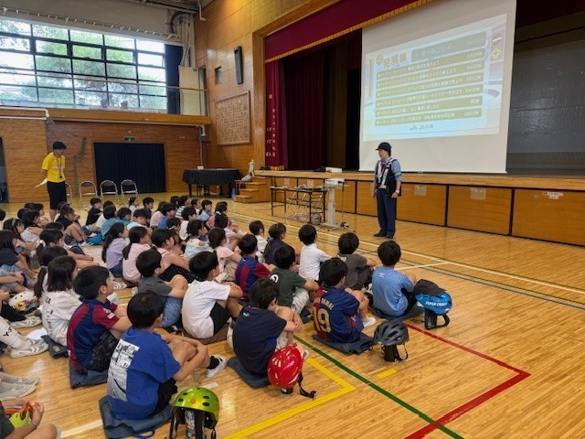 体育館では、DVDを視聴して交通ルール等を学びました。校庭では一人ひとり自転車に乗って、様々な危険を想定したコースを走りました。