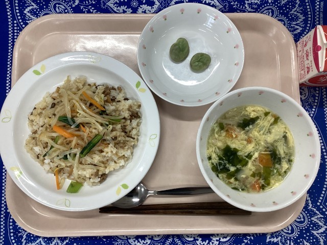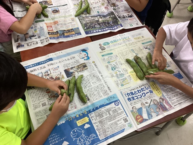 今日は2年生と一緒にそら豆のさやむき体験を行いました。