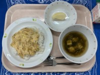 あぶ玉丼あおさ汁くだもの(りんご)牛乳あぶ玉丼は、油揚げを甘辛く煮て卵でとじたも...