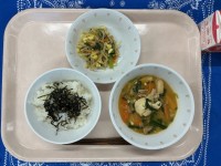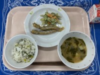 青菜めしししゃものからあげごぼうのカレーマヨあえじゃがいものみそ汁牛乳今日は、1...