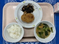 ごはんきんぴらコロッケひじきの煮つけえのきとこまつなのみそ汁牛乳給食で一番手間暇...