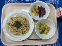 おろしスパゲッティみそドレサラダさつまいもスティック食べ比べ牛乳今日は、黄色いシ...