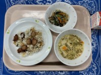 豚肉とごぼうのごはん高野豆腐の卵焼きキャベツのおかか和えすまし汁牛乳今日の卵焼き...