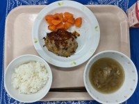 ごはんきのこハンバーグにんじんグラッセオニオンスープ牛乳きのこハンバーグには、み...