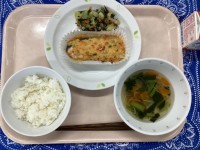 わかめごはん生揚げのそぼろあんかけキャベツとじゃこのサラダ牛乳よく給食を食べるク...