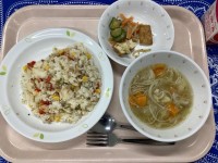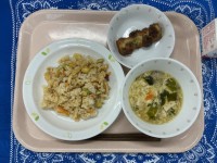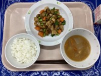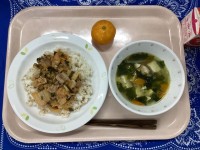 ごはんヤンニョムチキン茎わかめのサラダ豆腐と卵のスープ牛乳1時間目が始まる直前、...