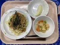 台湾まぜそばじゃがいものごまサラダくだもの(りんご)牛乳今日は新メニューの台湾ま...