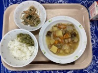 ごはんカレーじゃこふりかけ鶏じゃが野菜のごまみそかけ牛乳夏休みも終わり、成長のお...