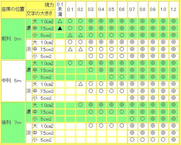 凡例】 ▲見えにくい者が多い。 △見える者があるが過半数は占めない。 ○見える者が過半数を占める。 ◎見える者が9割を占める。