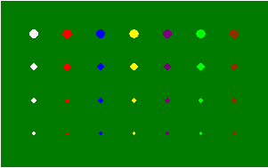 下の図は、左は黒板を想定して緑地に白・赤・青・黄色・紫・黄緑・茶色の点を4種類の大きさで描いたものです。