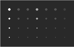 下の図ははそれをグレートーンで表したものです。白ははっきり、黄色も何とか見えますが、その他はあまりはっきりしませんし、区別もつきにくい状態です。