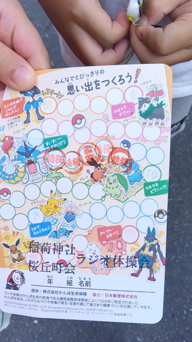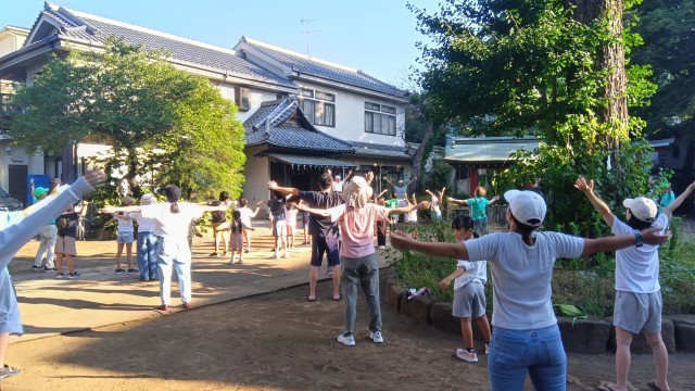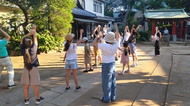 7月21日(月)~7月31日(木)の期間、千歳船橋駅前の稲荷森稲荷神社でラジオ体操が行われています。朝6時30分のNHKラジオの生放送に合わせて、たくさんの子どもたちが、桜丘町会や参商会など地域の皆様とともにラジオ体操を行っています。初日から毎日参加している子も、今日初めて参加した子も、どの子も気持ちよく体操を行い、一日がスタートしました。