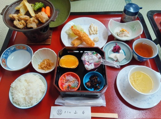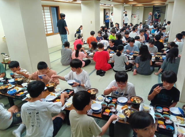18時15分から畳敷きの大広間で夕食をいただきました。配膳はホテルの方が行ってくださり、ゆっくり、美味しくいただくことができました。ごちそうさまの後は、食事係が声をかけながらテーブル毎にきれいに片付けをました。食事の後は、ふくべ細工体験を行います。