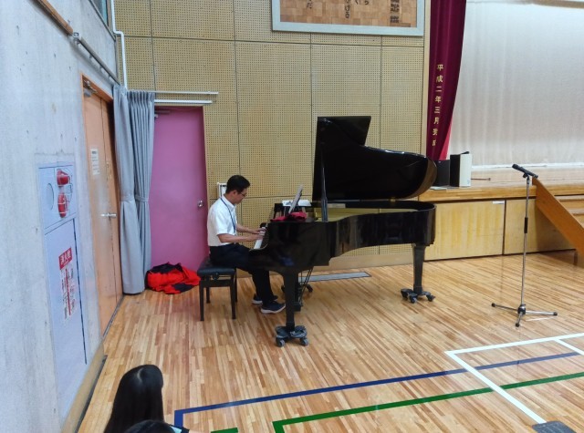 校長先生の今年の夏休みチャレンジは、校歌のピアノ演奏でした。子どもたちの応援の中、2番まで無事演奏し、大きな拍手がありました。