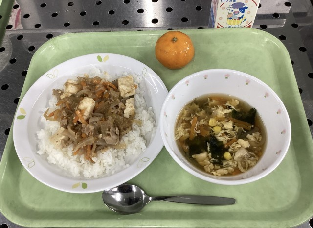 今日は、みそ豚丼、わかたまスープ、冷凍みかん、牛乳です。