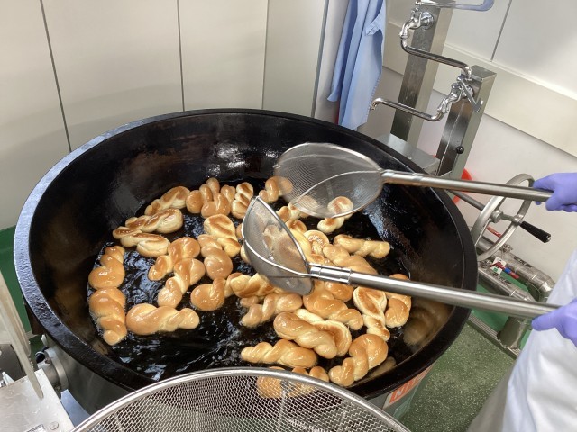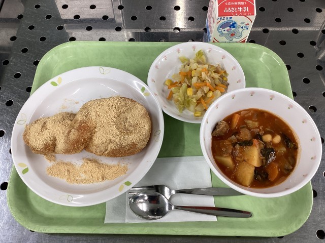 今日は、きな粉あげパン、野菜とハムのソテー、トマトシチュー、牛乳です。