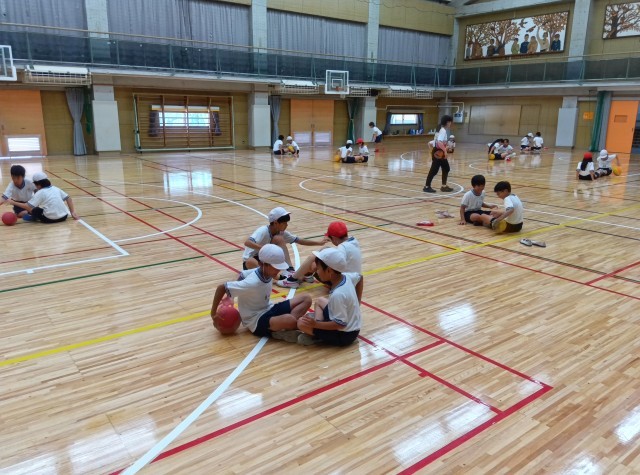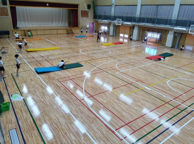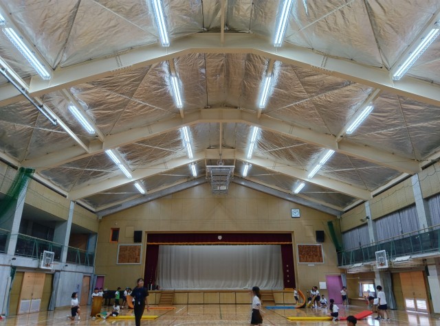 夏休みに体育館の改修工事が行われました。床の全面張替えと暑熱対策として天井に輻射熱反射シートの設置、窓面に遮熱カーテンの設置を行いました。9月に入っても猛暑日が続いており校庭体育は見合わせていますが、改修された体育館で子どもたちは思い切り体を動かしています。