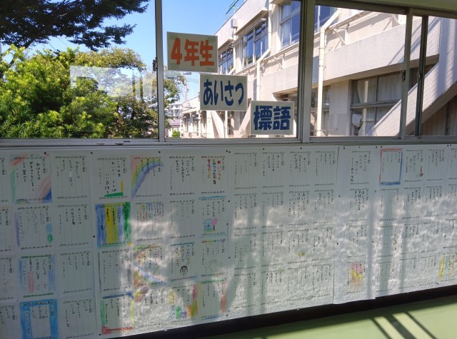 また、2階渡り廊下には、あいさつ標語も掲示されています。ぜひ、ご覧ください。