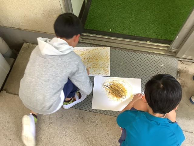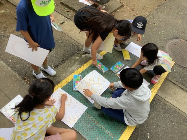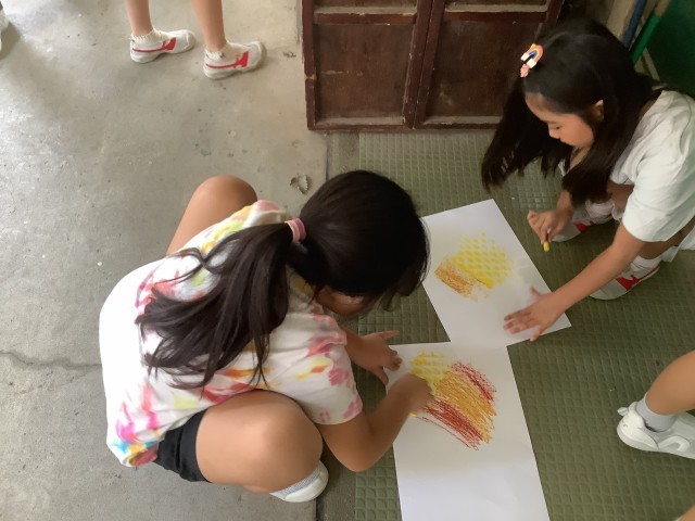 続いて、クレパスを使った「こすり出し」の技で、画用紙に楽しい模様が出現。